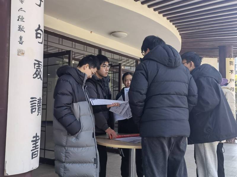 首先,三位成员在图书馆门口布置了宣传点,引得诸多同学前来问询。很多学生在宣传资料上了解了河海的专业设置,成员们进而结合资料信息,为高中的同学们详细地介绍他们感兴趣的专业。最终,同学们都领取到了一份涵盖分数线、院系专业、学术活动、文艺活动等信息的资料。在结束了宣传点的宣传后,成员们开始进行走班宣讲。先进行搜同 介绍,后进行心得分享。刘翔宇向同学们依次介绍了搜同 的办学历史、河海人才在重大工程中的贡献、优质专业与招生计划,然后结合自身经历,向高中的学弟学妹传授了实用的学习经验、鼓励他们朝着自己的目标前进。