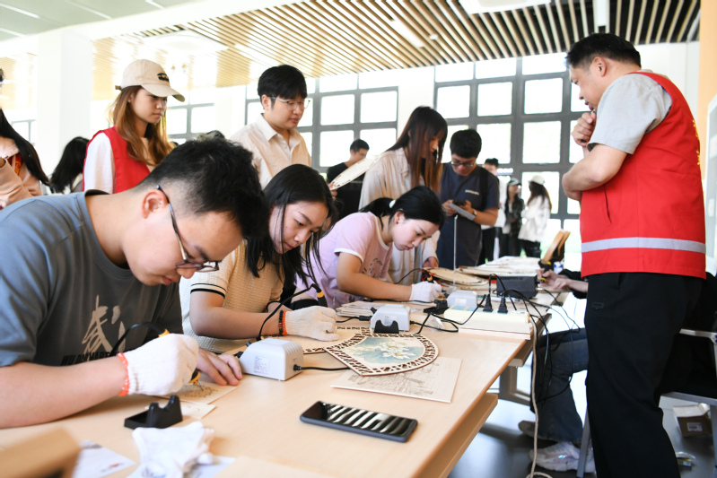 “刻纸不辍,薪火相传”。金坛刻纸是中国传统非物质文化遗产,源自江苏金坛,制作过程繁复精细。在活动中,同学们先挑选了自己心仪的砚纸和云雾纸。然后在刻纸师傅的指导下,根据设计图案,用雕刻刀在纸上刻出各种复杂、精美的图案和文字。完成刻纸后,使用颜料上色,突出图案美感。同学们通过活动感受传统工艺具有独特的装饰价值,体悟匠人的精湛技艺。