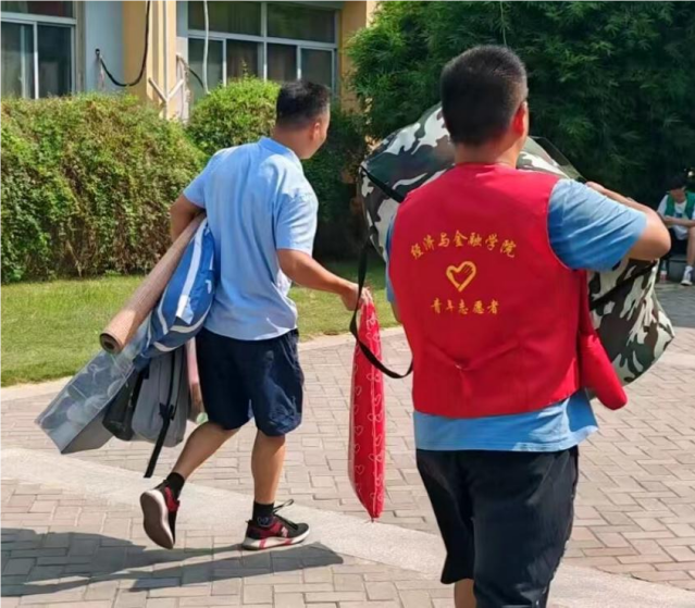 宿舍楼下,志愿者们帮助新生们搬行李,厚重的行李装载的不仅仅是衣物用品,更承载了新生们对大学生活沉甸甸的期待与希望。