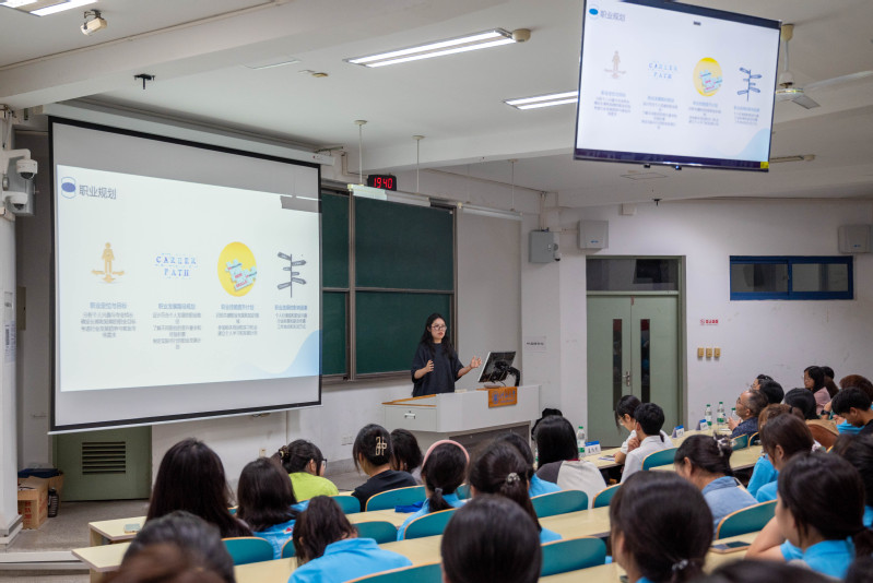 国际经济与贸易专业2018届朱琳娜校友,目前就职于华泰证券股份有限公司金融创新部。她着重向同学们介绍了大学期间的收获和毕业后的职业选择,认为大家应当在大学期间培养自学能力和人际沟通能力,以便于更好地适应毕业后的工作环境。此外,她还分享了自己的求职经历,从华泰证券常州分公司营业部入职,成为团队长,到参与内部招聘进入公司总部的历程中,同学们看到了朱琳娜校友不断提升能力、追求自我成长的身影。她寄语同学们“等风来,不如追风去”,愿同学们把握每一次机会,将大学生活过得充实精彩。