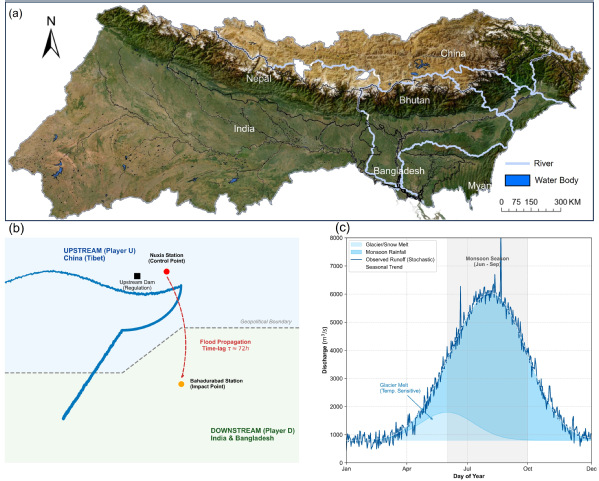 图1 在洪水季节期间,将洪水路径分析与中、印、孟之间的开环博弈模型进行整合
