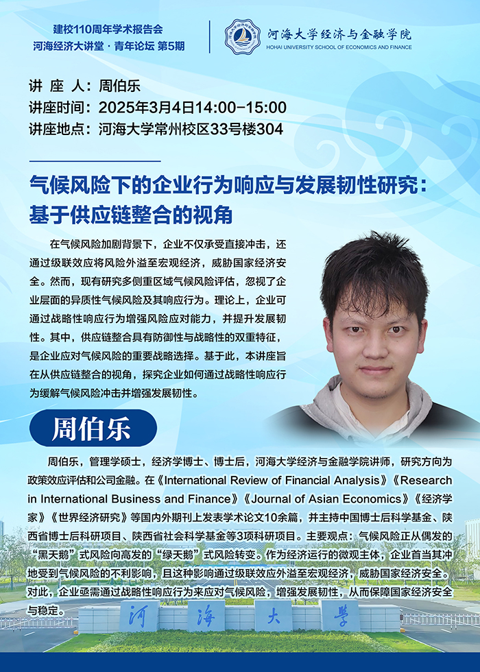 邀请贾册老师为广大师生做了题目为“Do Industrial Plants Actively Respond to Short-Term Regulations? Evidence from Chinas Air Quality Alerts System”的学术讲座。主持人丁童慧老师向全体参与人员介绍了贾册博士的研究方向及此次讲座的主要内容。贾册博士通过系统解析中国重污染应急预警制度的运行机制,揭示了工业企业污染减排决策的深层动因。其研究创新性采用自然实验法发现:高强度执法下的高级别预警能显著激发企业减排响应,但预警频次与级别的动态调整易诱发企业“警报疲劳”,形成边际效应递减现象。基于实证数据,贾册博士指出环境监管强度是实现政策效力的关键变量,提出构建预警级别-执法力度动态适配模型的创新思路,为破解运动式治理困境、推进大气污染精准防治提供了新的理论框架。在互动环节,师生们就环境预警阈值设定、政企博弈模型构建等学术前沿问题,与贾册博士展开了深度对话。贾册,经济学博士,搜同