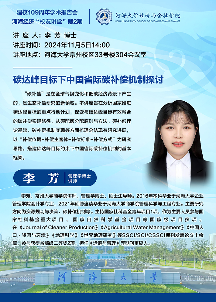 邀请了校友李芳博士为广大师生做了题为“碳达峰目标下中国省际碳补偿机制探讨”的学术讲座。李芳校友现就职于常州大学商搜同